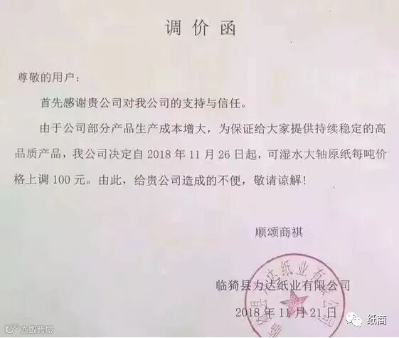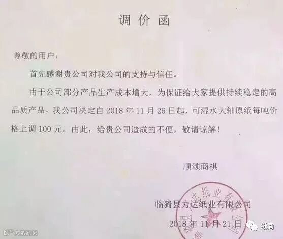 而在11月21日,临猗县力达纸业有限公司已就可湿水大轴原纸发布涨价函:自2018年11月26日起,可湿水大轴原纸每吨价格上调100元。