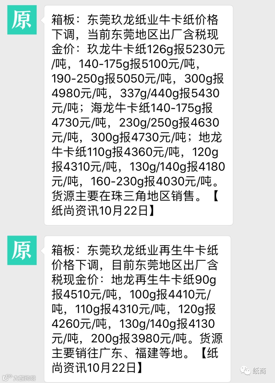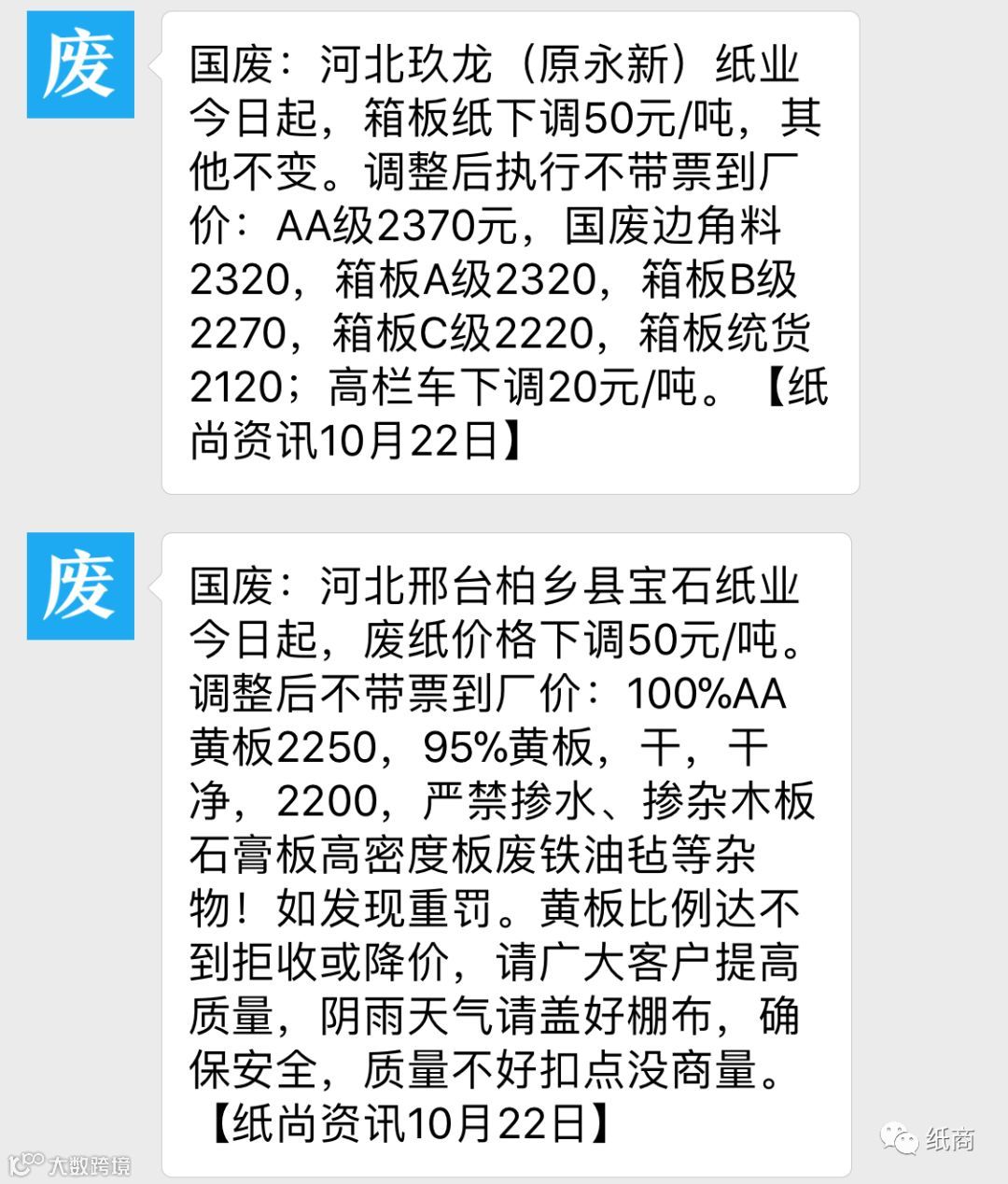 河北玖龙(原永新)纸业,箱板纸下调50元/吨,其他不变。调整后执行不带票到厂价:AA级2370元/吨、国废边角料2320元/吨、箱板A级2320元/吨、箱板B级2270元/吨、箱板C级2220元/吨、箱板统货2120元/吨。