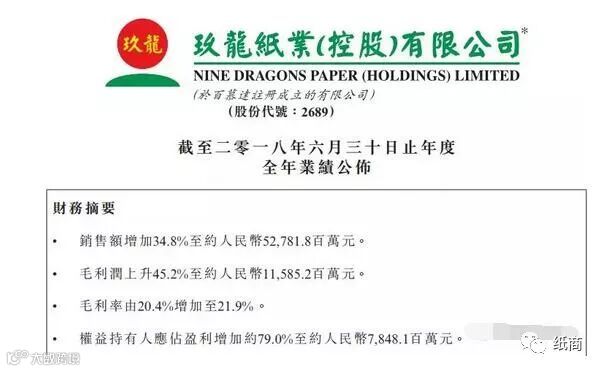 时至2018年9月19日,玖龙纸业公布截至2018年6月30日止年度的业绩,公司营业收入527.82亿元人民币,同比增长34.8%,首次突破500亿元。公司股东应占净利润78.48亿元,同比增长79%。两个数据均创历史最高。