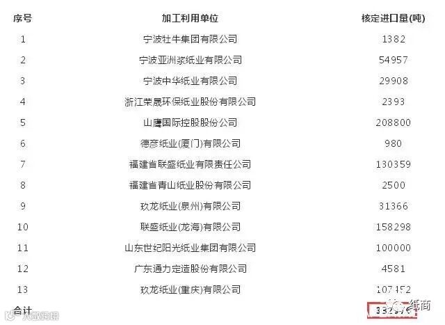 本批次名单中,山鹰系两家企业——山鹰国际和联盛纸业共获得33.9万吨许可量,是本批次中最多的企业。玖龙、联盛(龙海)和世纪阳光纸业也核准了超过10万吨的进口量。