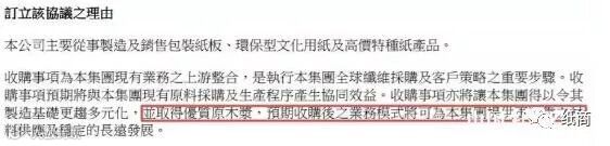 我们从玖龙纸业曾发布的公告里能发现一些蛛丝马迹,“收购事项为本集团现有业务之上游整合,是执行本集团全球范围采购及客户策略的重要步骤。收购事项预期将与本集团现有原料采购及生产程序产生协同效益。同时使集团得以令其制造基础更趋多元化,并取得优质原木浆,预期收购后的业务模式将为集团提供更可靠的材料供应及稳定的长远发展。”