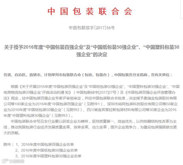 根据《关于开展2016年度“中国包装百强企业”及“中国纸包装50强企业”、“中国塑料包装30强企业”、“中国电商物流包装20强企业”评选活动的通知》(中国包联综字[2017]27号)及《中国包装百强企业评选管理办法》规定,经中国包装百强企业专家评审组审定,并经中国包装联合会批准,决定授予奥瑞金包装股份有限公司等100家企业为2016年度“中国包装百强企业”(见附件1)、深圳市裕同包装科技股份有限公司等50家企业为2016年度“中国纸包装50强企业”(见附件2)、四川省宜宾普拉斯包装材料有限公司等30家企业为2016年度“中国塑料包装30强企业”(见附件3)。