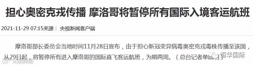 11月28日,摩洛哥政府在一份声明中表示,受近期新冠病毒变异毒株影响,摩洛哥将从11月29日开始停止接收所有飞往该国的国际航班,特别是来往欧洲和非洲的航班,为期两周。