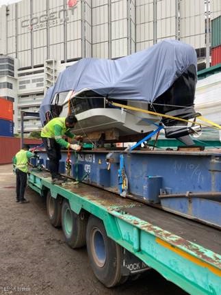 拖车外包商之平板货车带同托架到达装箱地点, 当天15:00开始从岸边吊起快艇, 放在托架上并包好艇覆布, 再吊到平板集装箱上并以扎带固定 最终于19:00顺利完成装箱, 并于第二天早上待船公司更改S/O好后交回码头(因应实际货物装箱后高度比之前估算大, 除超宽外还超高), 发到新加坡.