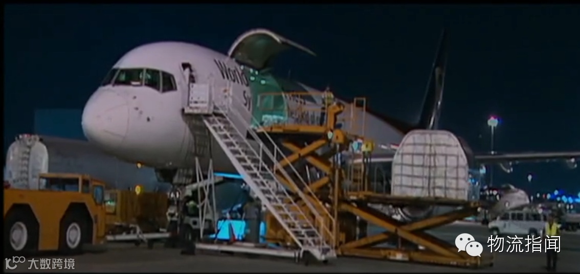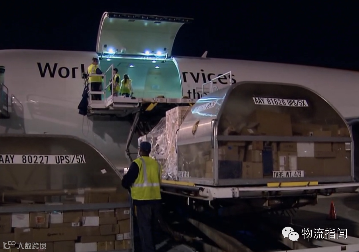 现在是晚上8点钟,收到的快件已经被装入被称为大箱的超大航空货柜,这些航空货柜的容量接近15立方米,差不多相当于一个大型办公室的隔间。完成装箱的货柜被搬上UPS的货机(图9),UPS货运站的工人驾驶大型的货柜牵引车,把满载的货柜送上待命的货机,剪刀式的高空作业装载机将货柜装入机舱内(图10)。UPS货机的装载量惊人,可以达到60多个货柜。这些货物最终都被送往UPS世界港的转运中心。