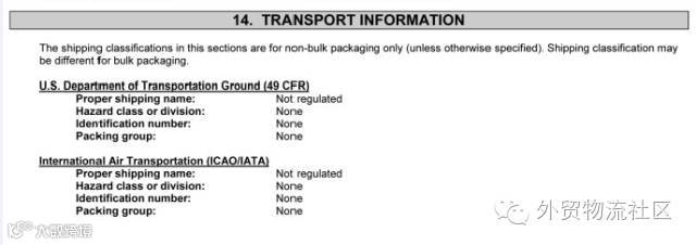 以上MSDS为全英文,非化学专业英语人员都很难理解。面对此类专业文献,国际货运代理从业人员仅需要理解第14部分的运输信息,作为结论,此货物在国际物流运输中不被视为危险品,而问题可以迎刃而解。