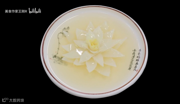 王刚大厨的开水是由整鸡、整鸭、整肘子和金华火腿等昂贵食材熬煮四小时而成。再通过肉蓉反复澄清之后,你就能得到一锅外表清澈、芬芳馥郁的开水,浇淋至精心堆砌的白菜上,便可呈现莲花散开之状。