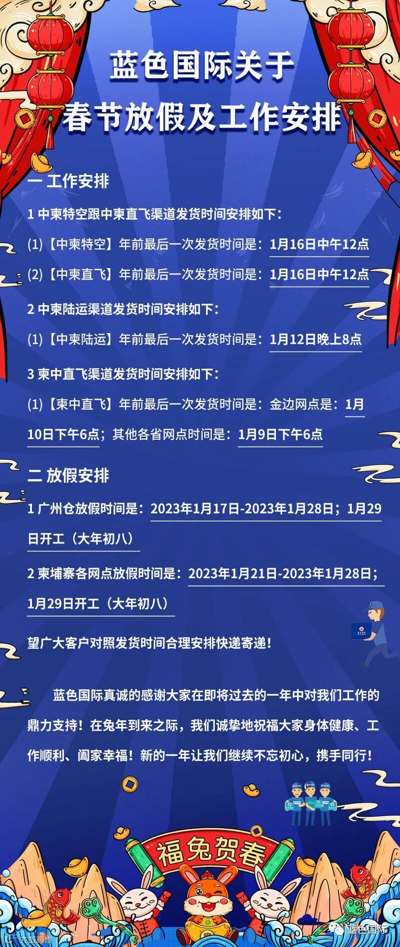 蓝色国际关于春节放假及工作安排