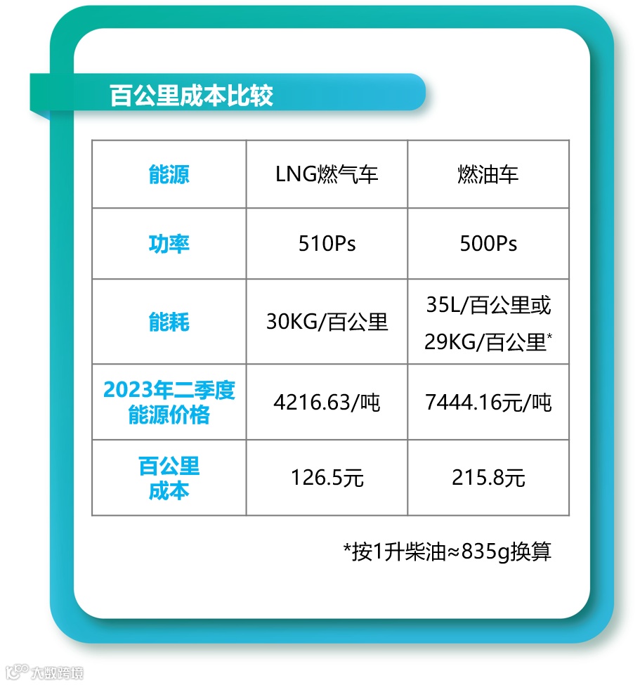 以某品牌马力接近的LNG燃气车和燃油车进行对比,在行驶里程相同的情况下,柴油的能源成本至少是LNG的1.65倍。