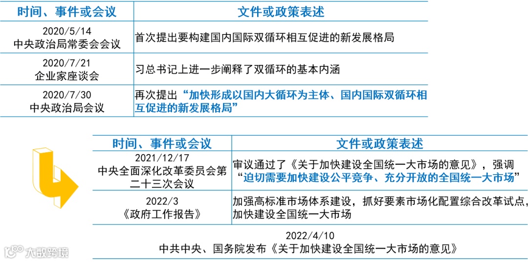 从2020年5月14日首次提出“国内国际双循环”到2021年12月17日中央深改会审议通过“统一大市场”意见,时隔近一年半,国家构建新发展格局重心突出在国内循环部分。