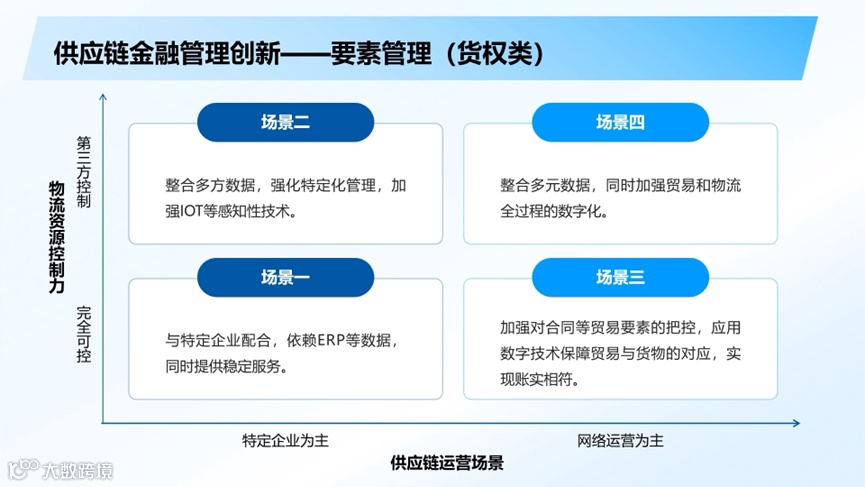对于货权类产品,货权与债权并不一样,比如像我们日照银行做的大宗物资和大宗商品,货权的关键在于物流资源是否可控,货权要求有扎实的物流网络的基础设施。货权类也可以分为四个场景,分别需要与特定企业配合、整合多方数据、加强对贸易要素的把握和整合多元数据。