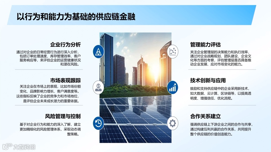 那么,什么样的能力和行为我们需要把控,我列了以下六点。第一是企业的经营行为,比如日常的订单处理速度、库存管理效率、客户服务响应等,可以作为供应链金融评判的依据。所以不一定非要发生应收应付,在此之前我们就可以开展供应链金融。当然还有管理能力的评估、市场表现跟踪、技术创新应用、风险管理与控制、合作关系等,都可以纳入进基于行为和能力的评价体系。
