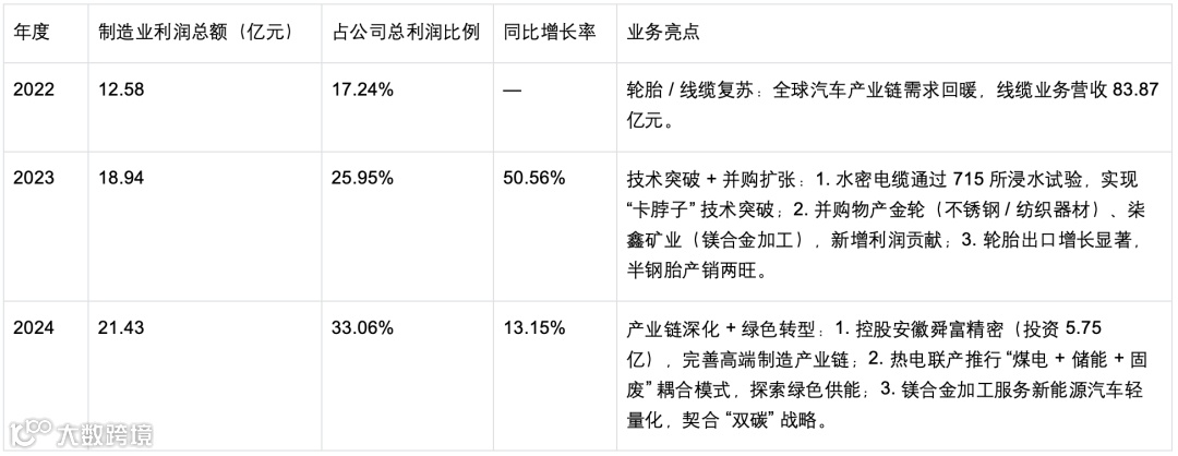 像物产中大亲自下场做制造业,2024年制造业的利润总额21.45亿元,已经超过公司总利润的33%,2023年制造业的利润总额18.94亿元,占公司总利润的26%,这几年物产中大制造业的利润不断上升。以下是2022年-2024年物产中大制造业利润表。
