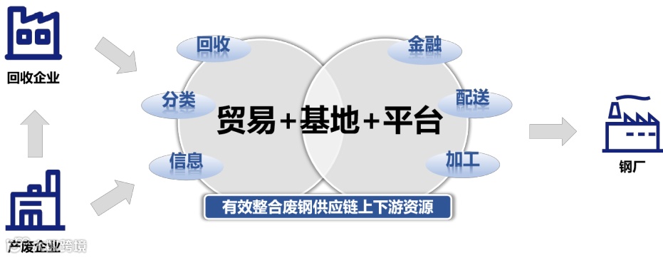 该模式主要应用于再生资源产业链,在交易业务平稳推进的同时,充分整合上游资源, 深度绑定终端客户,投资实体基地汇聚流量,构建集收购、金融、加工、配送、销售为一体 的模式。公司已在再生钢铁原料、再生不锈钢等品种开展布局。