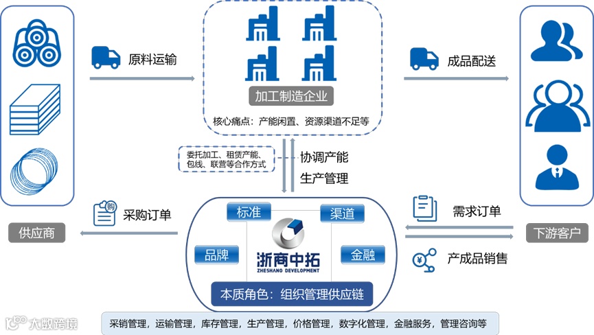 浙商中拓所属行业为现代服务业中的生产性服务业,核心主业为面向产业客户的供应链集成服务。公司聚焦于各类基建和制造业客户的供应链需求痛点,融合公司全国线下网络和数智化运营平台,协同整合社会仓储、运输及加工等资源,为供应链客户提供端到端的产销衔接、库存管理、物流配送、生产加工、产业金融、价格管理、生产管理和咨询、数字化等全链条集成化和一站式服务。