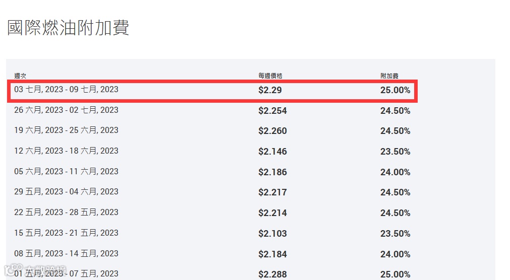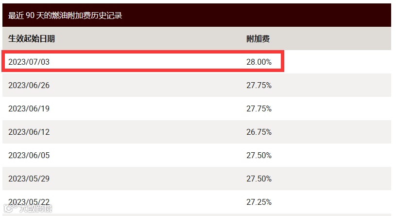FedEx联邦快递燃油附加费为每周更新,2023年7月3日FedEx联邦快递燃油附加费费率为:25%
