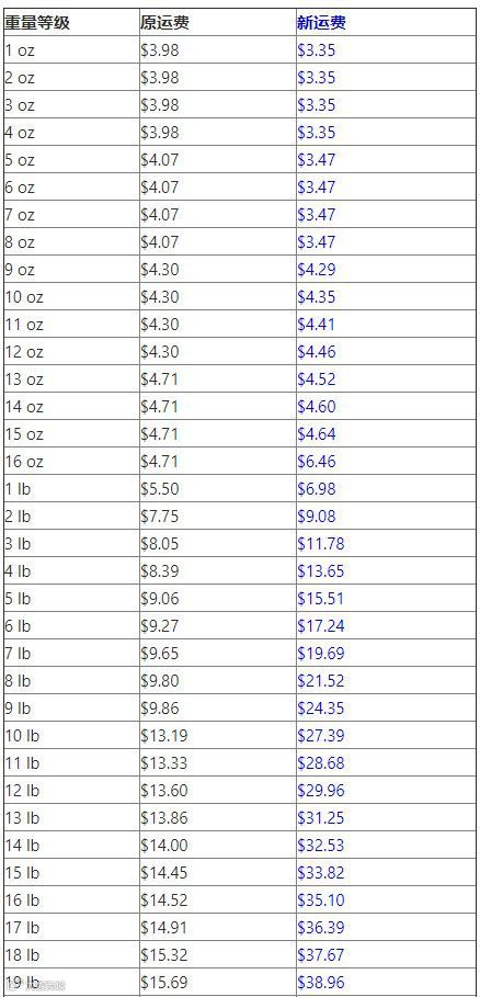 从更新的表格来看,10oz以下的重量运费略有下调