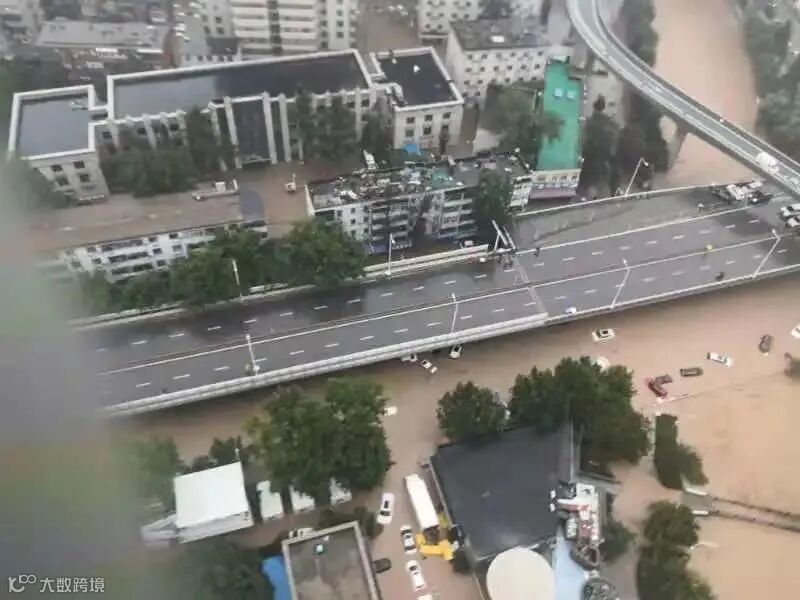 19:35 移植医院所在的两条道路交叉口,金水河漫灌,医院协调员叮嘱专差不要前往。虽知危险,但为了患者生命能早一分看到希望,专差仍尝试走下高架。中华骨髓库工作人员和医院协调员的心都揪了起来,既担心专差的安全,又为患者病情着急。无奈高架下无法前行。