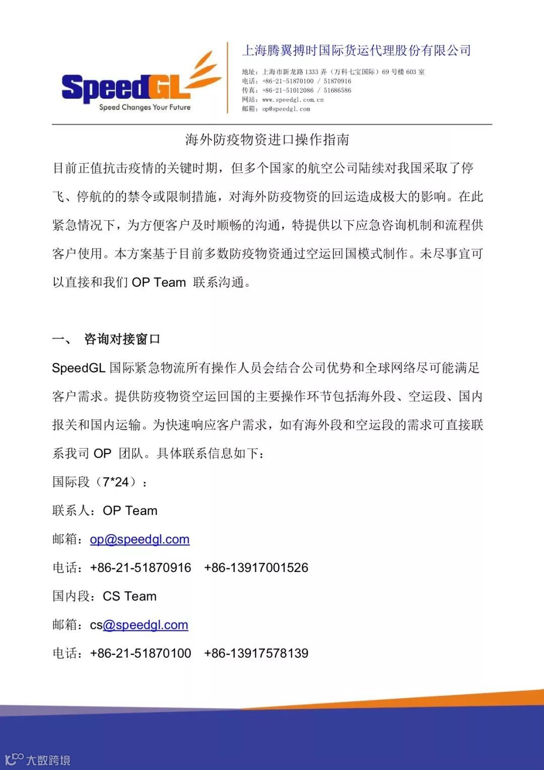 腾翼搏时目前正值抗击疫情的关键时期,但多个国家的航空公司陆续对我国采取了停飞,停航的的禁令或限制措施,对海外防疫物资的回运造成极大的影响。在此紧急情况下,为方便客户及时顺畅的沟通,特提供以下应急咨询机制和流程供客户使用。本方案基于目前多数防疫物资通过空运回国模式制作。未尽事宜可以直接和我们OP Team联系沟通。