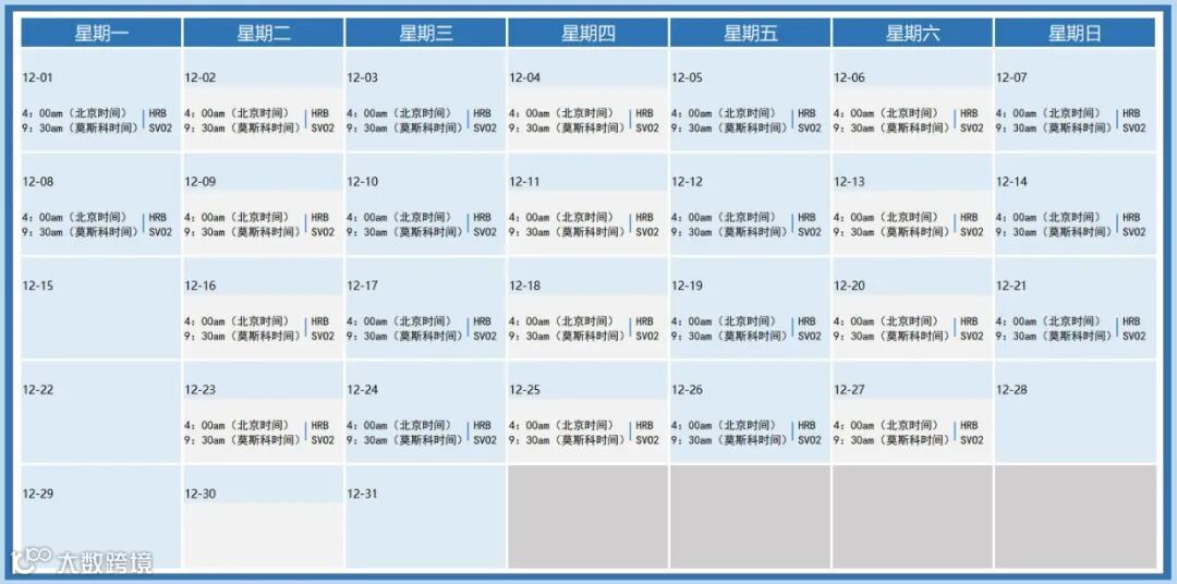 龙江航发自营哈尔滨-莫斯科货运航线,采用Tu-204系列机型运力,为中俄跨境贸易提供稳定、快捷的航空物流通道。12月计划班期为1日、2日、3日、4日、5日、6日、7日、8日、9日、10日、11日、12日、13日、14日、16日、17日、18日、19日、20日、21日、23日、24日、25日、26日、27日。