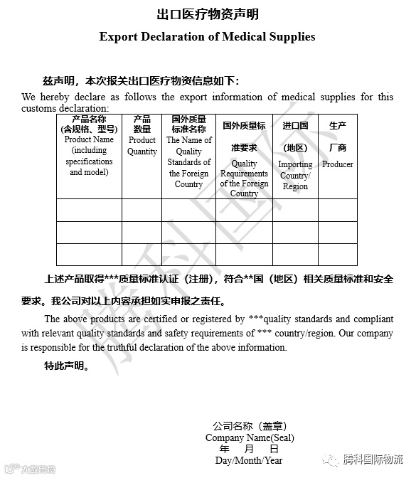 二、进一步规范医疗物资出口秩序。自4月26日起,产品取得国外标准认证或注册的新型冠状病毒检测试剂、医用口罩、医用防护服、呼吸机、红外体温计的出口企业,报关时须提交书面声明(参考附件2),承诺产品符合进口国(地区)质量标准和安全要求,海关凭商务部提供的取得国外标准认证或注册的生产企业清单(中国医药保健品进出口商会网站www.cccmhpie.org.cn动态更新)验放。