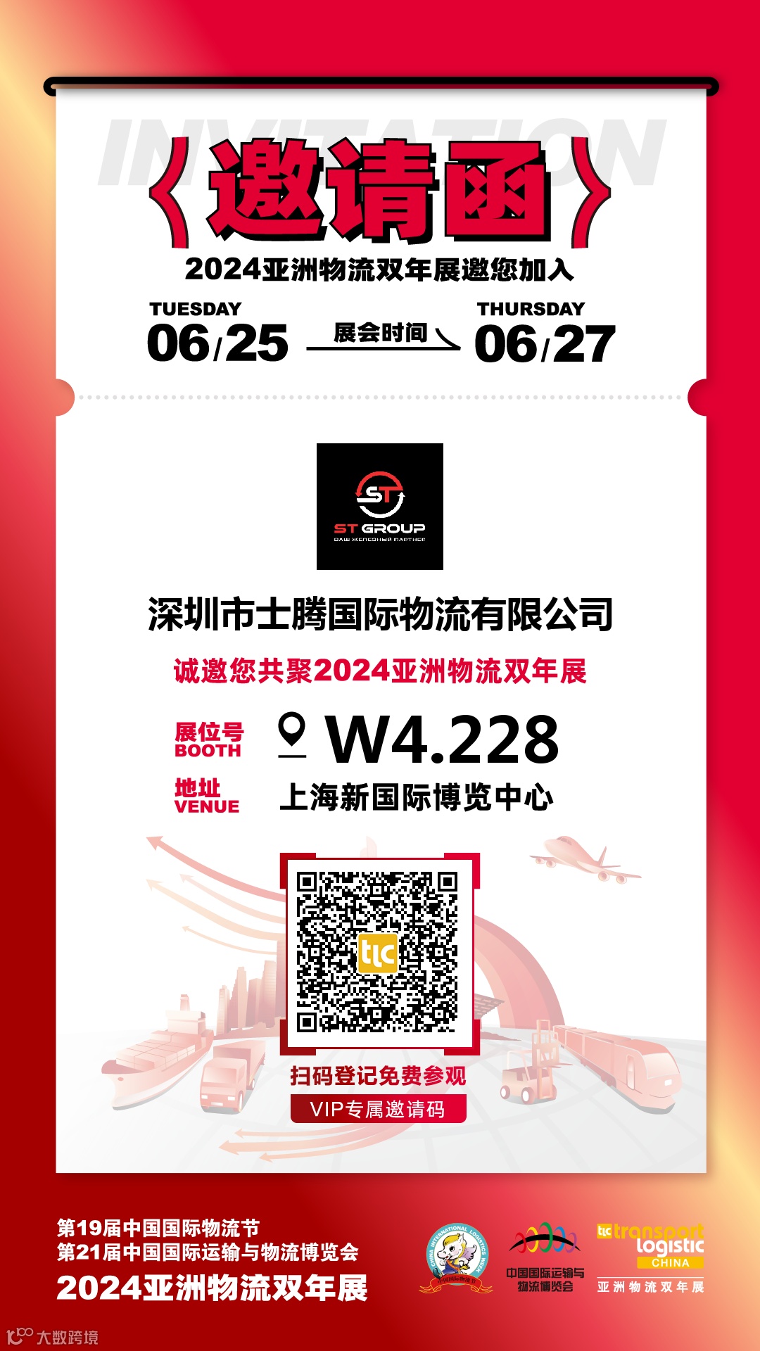 深圳士腾将参展于2024年6月25至27日在上海新国际博览中心举办的2024亚洲物流双年展,现诚邀各位客户与同行朋友莅临W4.228展位参观,扫描下方二维码可查看本次士腾参展内容,海报二维码可免费登记门票,期待各位朋友的参与!