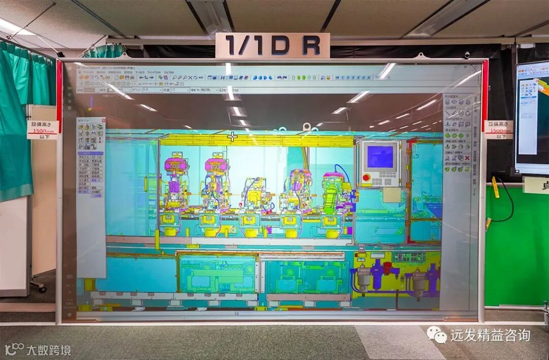 在贞宝工厂中还有这样的事例。一块手工制作的150英寸的显示器上,投影着实际尺寸的设备数字模型,在这里可以通过实际操作检验设备运转动向,有助于制作完成更加精密的设计图。