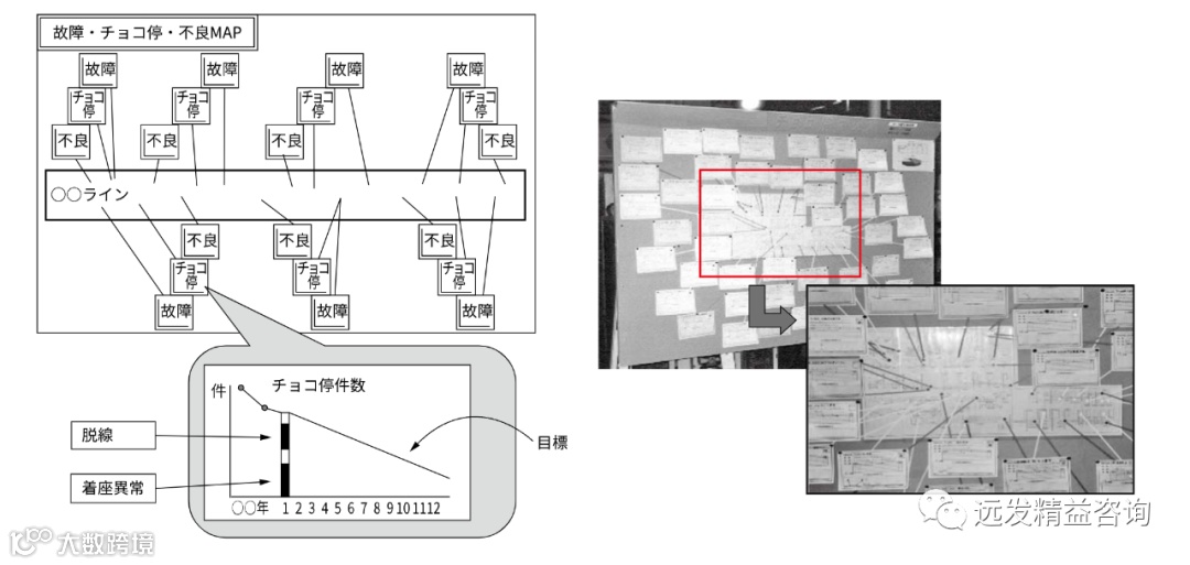 这里的重点是确认各工序的能力平衡。如果瓶颈工序的设备小停机时间的占有率高的话,可以使用详细的小停机发生地图和检查表,将小停机发生情况可视化。