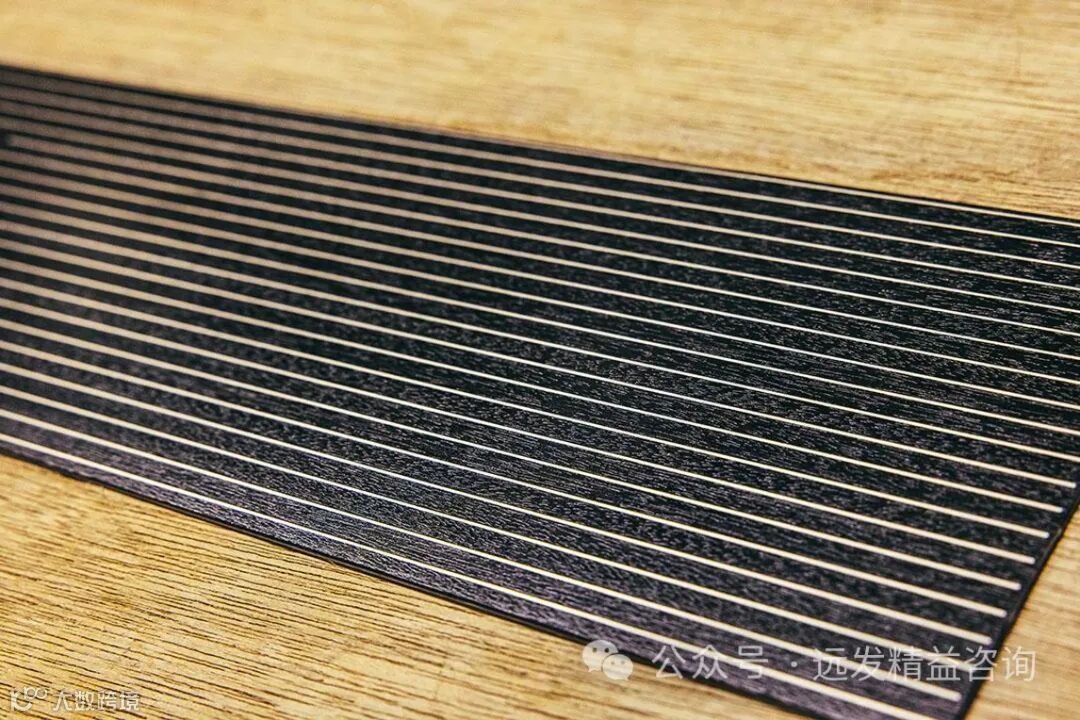 装饰面板是一种由装饰木材、铝制材料板以及芯材构成的三层板。制作纤细条纹时,要利用激光对最上层的装饰木材进行切割加工,使板材露出第二层的铝制材料板。