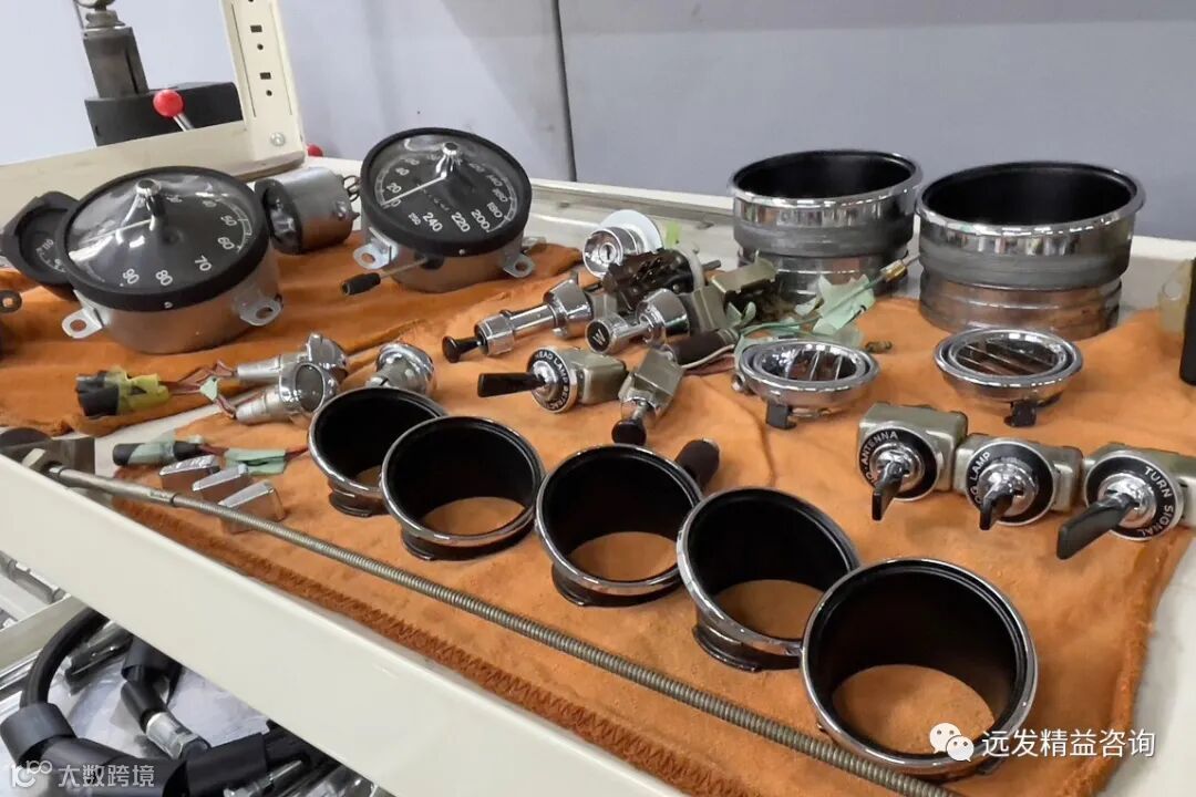 车库深处的架子上分门别类,整齐地摆放着从驾驶座位前的仪表盘上拆卸清洗后的车速仪表盘、发动机转速仪表盘、时间表、收音机等零件,待后续安装使用。