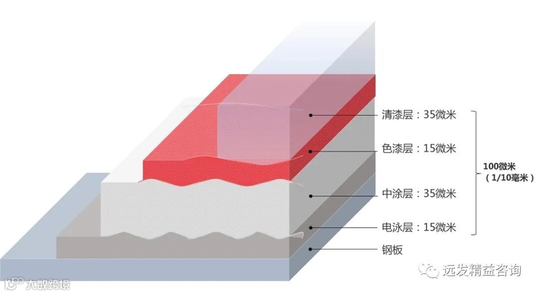 车漆的厚度只有1/10毫米(100微米)左右。但是这薄薄一层汽车“皮肤”却是由四层涂面构成,也就是要经历4道涂装工序。