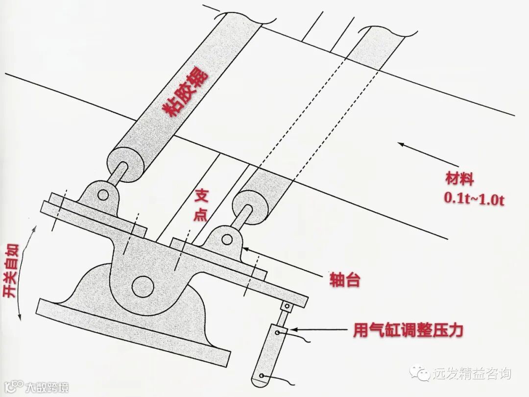 至今为止一直使用的是上下、左右4个气缸进行开关,设备费花费大,卸粘胶辊也非常花费时间。