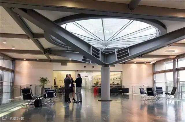 ▲ 这种巨大的树状支撑结构,是工厂中反复出现的元素。圆形天窗既是视觉冲击,又能带来更多的光线,使得这个原本已经足够通风的空间更加开放。
