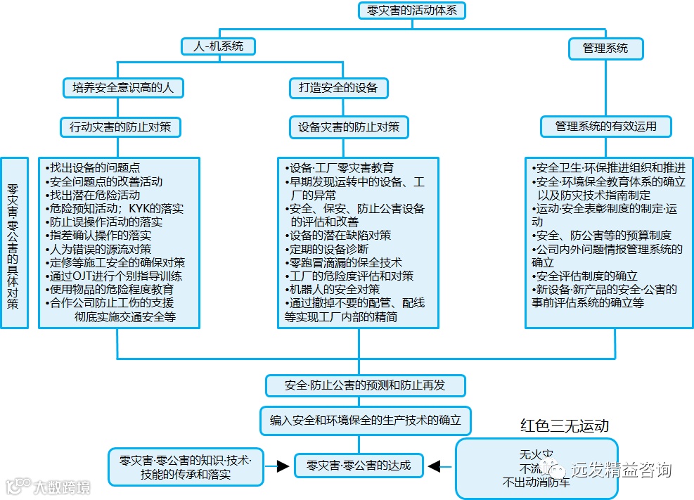 为了确保劳动者的安全和卫生,国家根据《劳动安全卫生法》规定了各企业应该致力于安全组织、活动内容等事项。因此,各企业以零灾害的职场为目标,开展本质安全化的活动。灾害是不安全状态和不安全行动重叠起来发生的,首先企业把工作环境变成安全状态是很重要的。