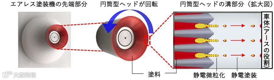 静电微粒化技术一般应用于喷出极少量液体的美容器具等,而丰田将该技术应用于车身喷漆上。具体而言,该喷涂机的喷头是圆柱形的,大约有600个特殊的凹槽,旋转可产生离心力,让车漆流入凹槽并通过静电微粒化,从而开发除了全球首款利用静电将涂料的粒子附着在车体上的技术。