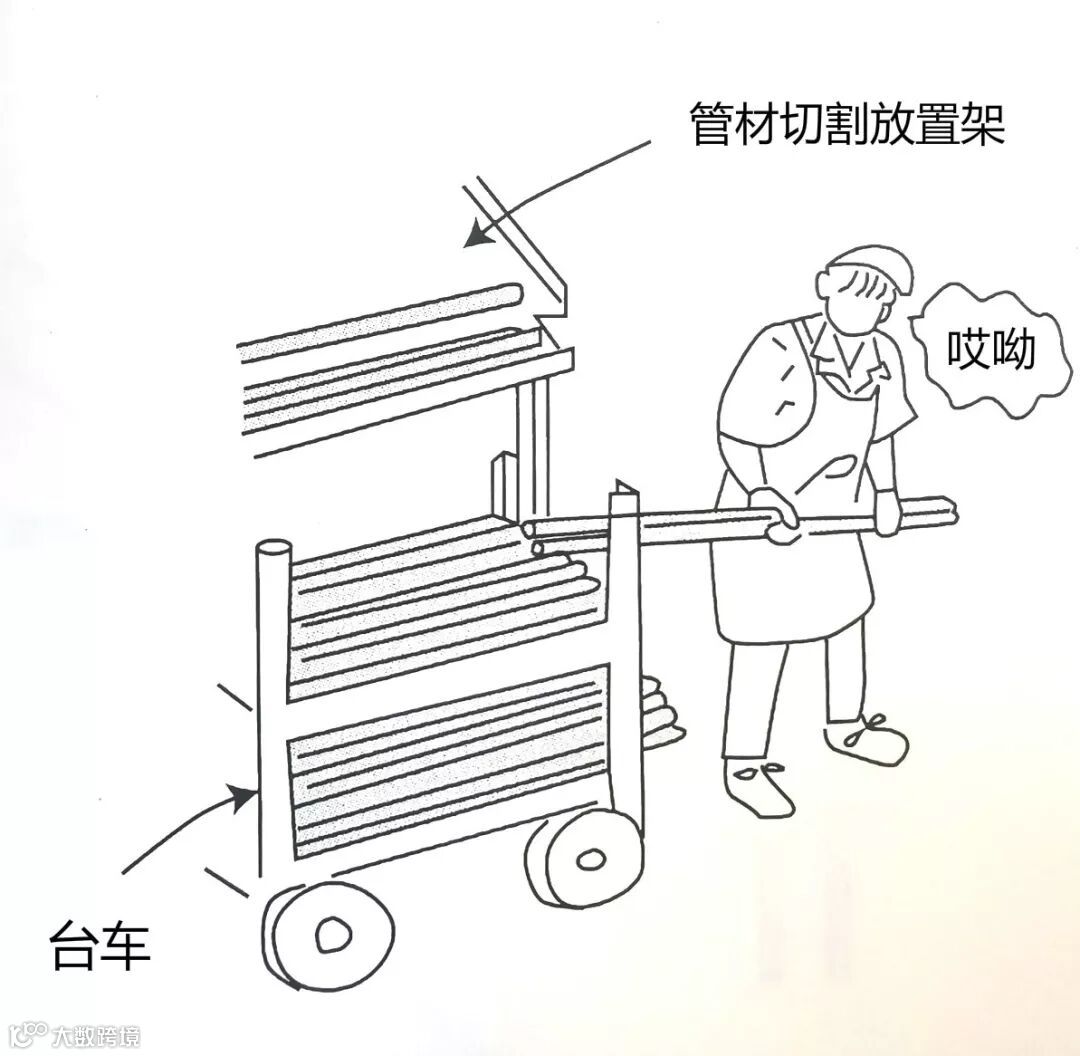 在切断的管材放置架和放置管材的台车之间安装一个简易型的滑竿、管材就可以直接从放置架上滑动到台车上。把台车下层的支柱截一节下来,还是利用滑竿,管材也可以轻松滑到台车下层,上下层可以充分利用。