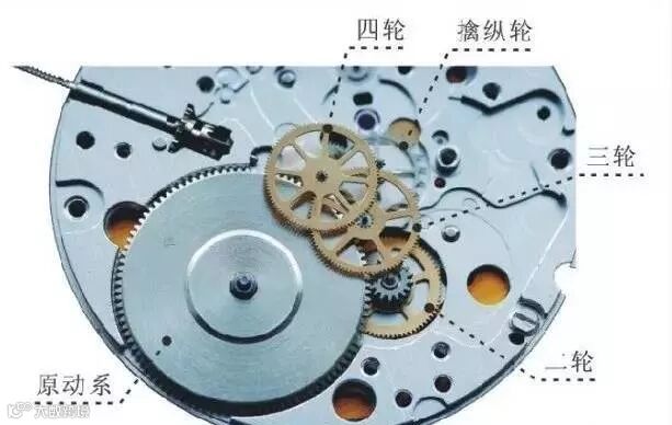 传动系由中心轮、过轮、秒轮、擒纵轮等组成,是将发动力传动至擒纵轮的一组传动齿轮,并带动指针机构。