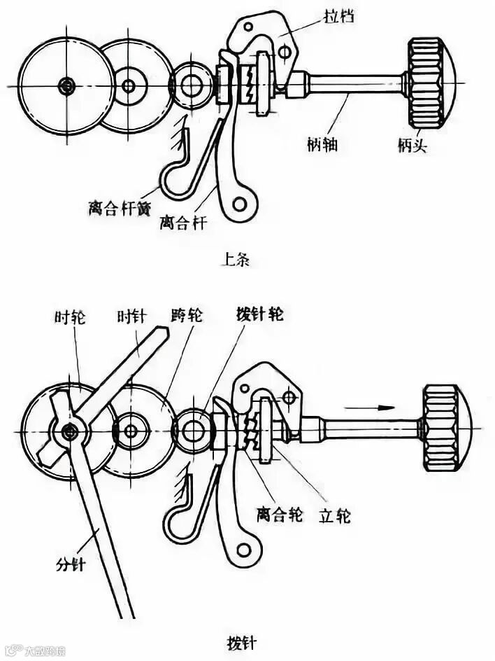 上条系由使用手表的人通过装在表壳外侧的柄头部件来实现手工卷紧发条的,拨针亦是同理。无论是摇板式或离合轮式的上条拨针机构,齿轮传动是广泛应用的传动型式,而立轮与小钢轮的传动、离合轮和拨针轮的传功又是具有特殊形式的齿轮传动。