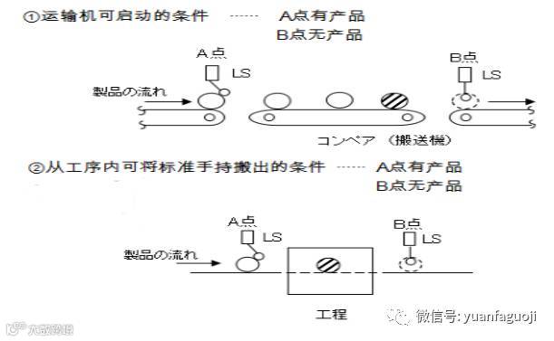 在自动传输生产线,有一种“AB两点控制”的方法,是为使工序内或工序间经常保持一定量的标准手持,将各个运送机的运送条件以及从工序中将产品搬出的条件,设计成两处(A点,B点)是否有产品,来控制的一种生产模式。