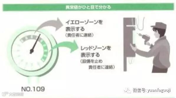 机械的数据等,比如:我们可以看指针位置是否处在正常值?刻度周围可以设置黄色区域(正常),红色区域(不正常),让所有人一目了然。并且,明示出“异常情况”时的处理方法,让其他人能够及时采取措施。