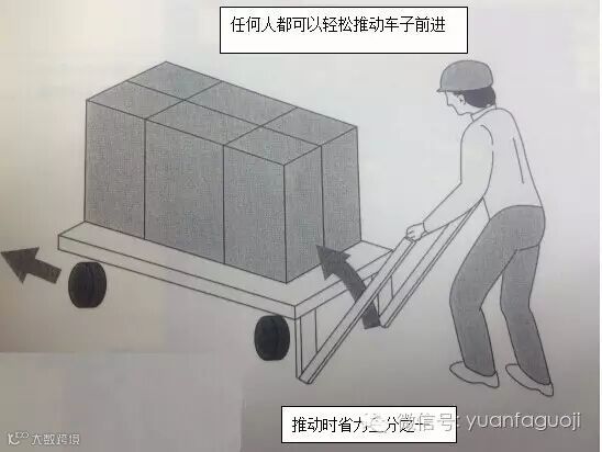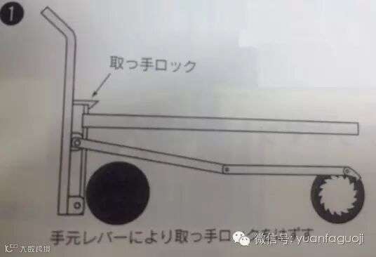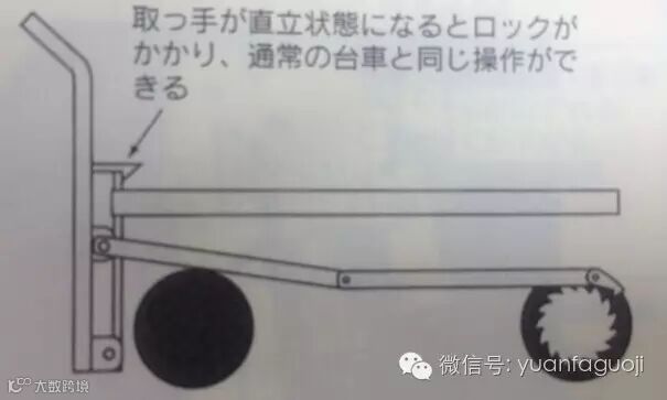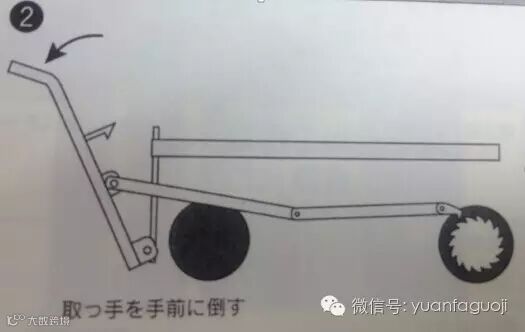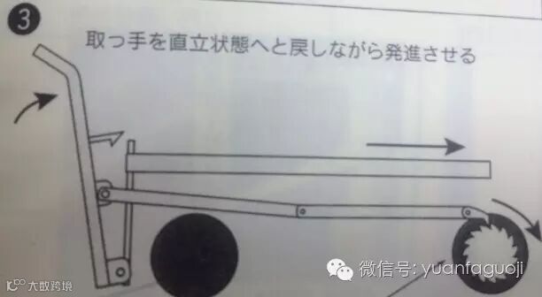 3)将把手还原至直立状态的同时推动推车前进。这时,由于杠杆的推动力,使轮胎向前行驶