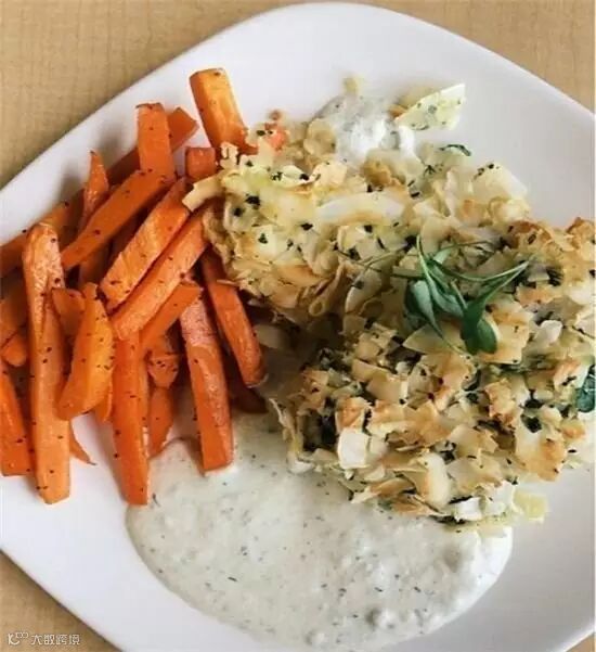 岩石鳕鱼、胡萝卜炸薯条再配上柠檬莳萝酱汁