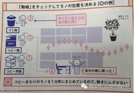 把这些行动标注在住址号码一览图上,就能清楚得知人员影印时的动线。随后我们将会察觉到诸如影印纸摆得太远,补充时会造成行动上的浪费,丢弃影印纸包装时,要走几步才能抵达垃圾桶等等情况。