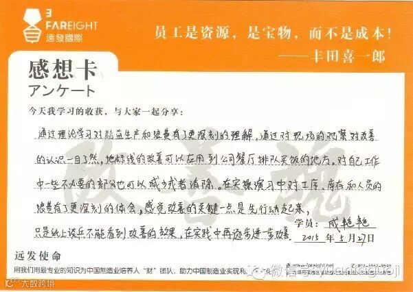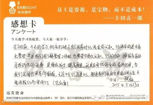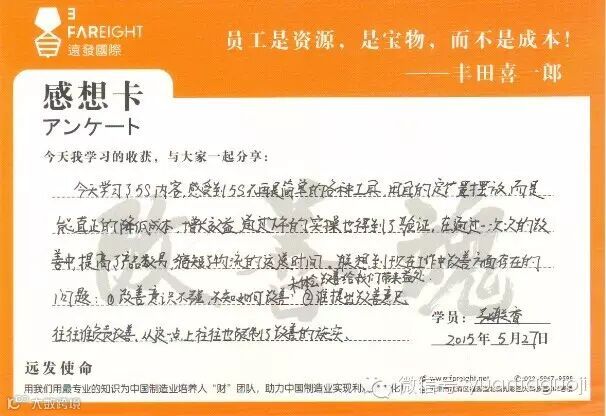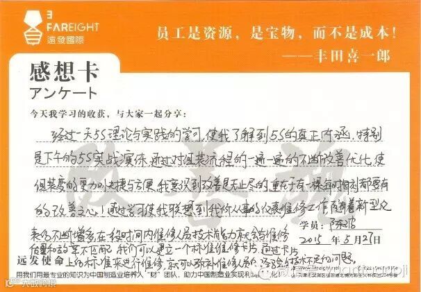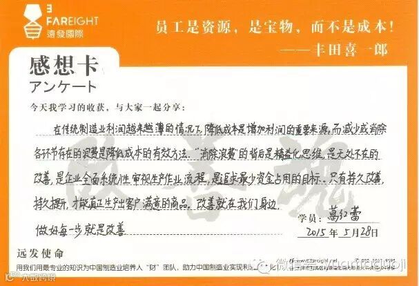 京博控股精益生产特训营第二期于2015年5月27日在远发国际天津道场召开。在整个培训过程中,学员们主动参与、积极思考,气氛热烈。学员反馈学到了很多理论及实践知识,与以往的培训方式截然不同,学员通过亲自动手后,对精益的理解更加深刻,在课程中学员询问了老师关于推动精益活动的问题,解决了工作中遇到的一些疑惑,受益匪浅,指导性很强。