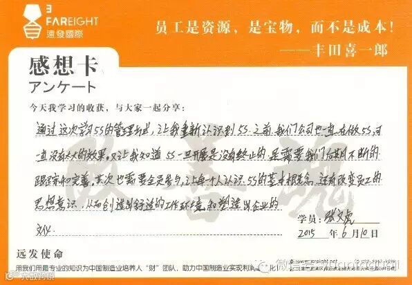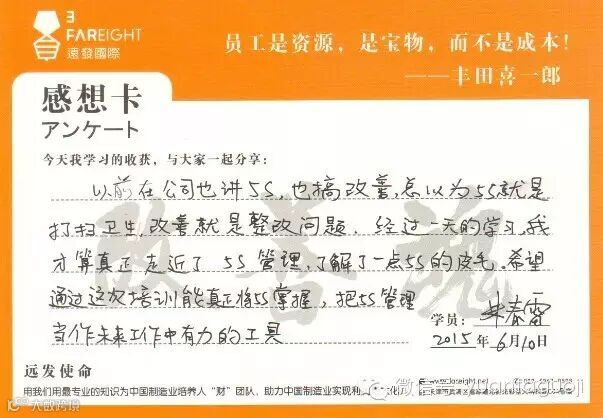 训道之初级人财育成第四十四期于2015年6月10日在远发国际天津道场召开。在整个培训过程中,学员们主动参与、积极思考,气氛热烈。学员反馈学到了很多理论及实践知识,与以往的培训方式截然不同,学员通过亲自动手后,对精益的理解更加深刻,在课程中学员询问了老师关于推动精益活动的问题,解决了工作中遇到的一些疑惑,受益匪浅,指导性很强。