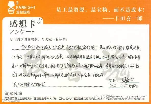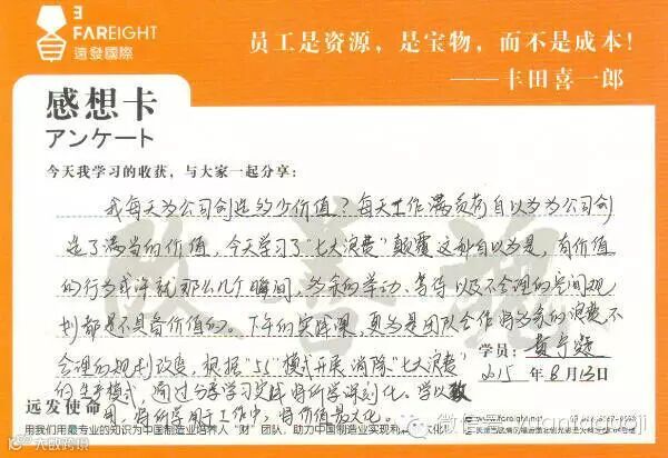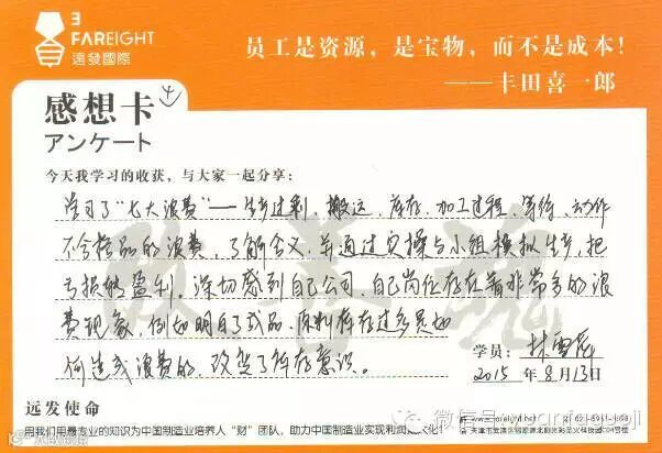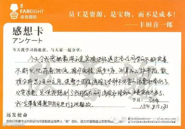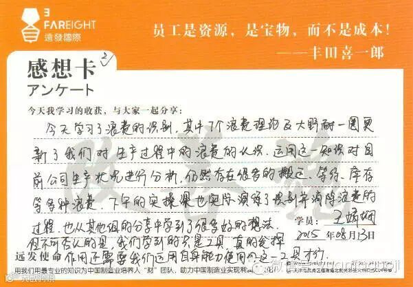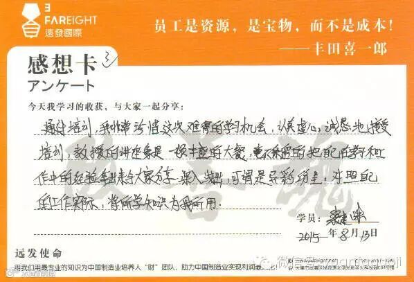 训道之初级人财育成第四十七期于2015年8月12日在远发国际天津道场召开。在整个培训过程中,学员们主动参与、积极思考,气氛热烈。学员反馈学到了很多理论及实践知识,与以往的培训方式截然不同,学员通过亲自动手后,对精益的理解更加深刻,在课程中学员询问了老师关于推动精益活动的问题,解决了工作中遇到的一些疑惑,受益匪浅,指导性很强。