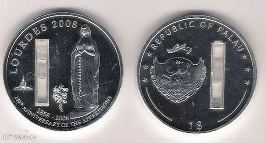2008年,帕劳共和国发行一款纪念币。这个纪念币上有一个管型图案,里面有卢尔德的水。
