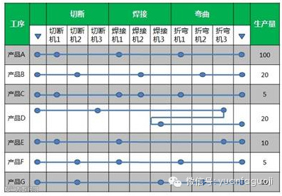 产品通过的工序用 ● 表示,按照工序顺序用线连起来。将类似的工序系列的产品进行分类,以上图为例,我们通过图例可以看出产品ACE属于类似产品。