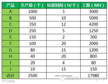 某公司生产的产品、生产量以及工数之间的关系如下图所示。