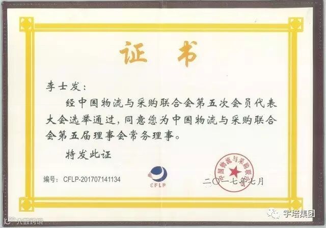 经中国物流与采购联合会第五次会员代表大会选举通过,上海宇培(集团)有限公司董事长李士发先生当选中国物流与采购联合会第五届理事会常务理事。与此同时,上海宇培(集团)有限公司成为中国物流与采购联合会常务理事单位。